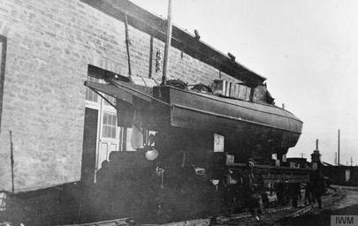 A coastal motor boat arrives by rail at Baku. July 1919.jpg (800x506)