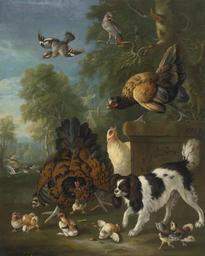 | Keywords: A family of chickens fending off a spaniel in a landscape.jpg Artwork en A family of chickens fending off a spaniel in a landscape 1728 oil on canvas Size cm 105 4 84 5 object history exhibition history credit line place of creation signed and dated center right PCaĆ’steels F/1728 PD-old-100 http //www sothebys com/en/auctions/ecatalogue/2014/old-master-paintings-n09161/lot 70 html accession number Uploaded with UploadWizard Peter Casteels III | ||||
