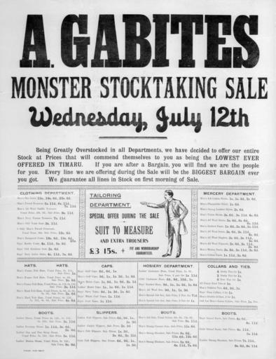 Keywords: blackandwhite monochrome text black and white Text lists bargains in clothing department, mercery department, hats, hosiery, collars and ties, boots and slippers. Quantity: 1 b&w art print(s). Physical Description: Letterpress, black and white, 573 x 442 mm. A. Gabites (Timaru) :Monster stocktaking sale, Wednesday, July 12th. Timaru Post Print [1880s?].. Ref: Eph-D-COSTUME-1880s-01. Alexander Turnbull Library, Wellington, New Zealand. natlib.govt.nz/records/22724494 Text lists bargains in clothing department, mercery department, hats, hosiery, collars and ties, boots and slippers. Quantity: 1 b&w art print(s). Physical Description: Letterpress, black and white, 573 x 442 mm. A. Gabites (Timaru) :Monster stocktaking sale, Wednesday, July 12th. Timaru Post Print [1880s?].. Ref: Eph-D-COSTUME-1880s-01. Alexander Turnbull Library, Wellington, New Zealand. natlib.govt.nz/records/22724494 |