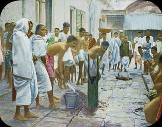 | Keywords: A goat sacrifice, India, ca. 1906 (IMP-CSCNWW33-OS14-58).jpg en <br> A goat sacrifice India ca 1906 Tinted lantern slide showing a group of men and women gathered around the sacrifice of a goat The goat's head sits in a wooden rest whilst its body lies a distance away on the ground A bare chested man stands with a cleaver placed above a bucket The sacrifice seems to take place in a stone courtyard The goat would have been killed as part of a ceremony by Jhatka decapitation by a single blow Animal sacrifice is not a prescribed part of Hinduism although it is practised in northern India by worshippers of the goddess Kali This slide comes from a collection created by missionaries from Regions Beyond Missionary Union an interdenominational Protestant evangelical mission working in northeast India Bihar and Orissa and Nepal Photographer Unknown Filename IMP-CSCNWW33-OS14-58 tif Coverage date 1900/1910 Subject unesco Religious activities; Customs and traditions Part of collection International Mission Photography Archive ca 1860-ca 1960 Part of subcollection Photographs from the Centre for the Study of World Christianity University of Edinburgh U K ca 1900-ca 1940s Repository name Centre for the Study of World Christianity Archival file Volume3/IMP-CSCNWW33-OS14-58 tif Repository address The University of Edinburgh School of Divinity New College Mound Place Edinburgh EH1 2LX United Kingdom Geographic subject country India Format aacr2 lantern slides 8 2 x 8 2cm Geographic subject continent Asia Rights Contact the repository for details Part of series Regions Beyond Missionary Union India captioned lantern slides CSCNWW33/OS14 Repository email divinity-CSWC ed ac uk Date created 1900/1910 Publisher of the digital version University of Southern California Libraries Subject aat genre general views Format aat lantern slides; photographs Geographic subject state Bihar Access conditions http //www ed ac uk/schools-departments/divinity/research/centres/world-christianity/collections-resources Geographic subject populated places File CSCNWW33/OS14/58 Subject lcsh Animal sacrifice; Hinduism 1900/1910 date created author http //digitallibrary usc edu/cdm/ref/collection/p15799coll123/id/78273 PD-old-70-1923 Magic lantern images Images from USC Digital Library uploaded by Fæ International Mission Photography Archive ca 1860-ca 1960 Animal sacrifice in India Animal sacrifice in art |