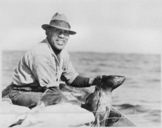 | Keywords: A legal catch. Fifty pounds of meat to gorge the folks with - NARA - 298718.jpg Scope and content A legal catch Fifty pounds of meat to gorge the folks with The seal has two spear points imbedded in the chest and neck and buried deep The tops came off when the spear was withdrawn after the hunter hurled the spear at the sleeping animal In accordance with Indian Treaties the Indians may hunt only with aboriginal weapons no motors may be used in order to reach the seals that pass at a distance of twenty five miles off the Indian villages along the seacoast of the Pacific No rifles are allowed in the canoes nor any other type of firearms Scope Content File contains a series of photos dealing with the tradional hunting and fishing methods of Native Americans at the Taholah Agency Washington General notes 298718 Local identifier Department of the Interior Bureau of Indian Affairs Taholah Indian Agency 09/17/1947 - 1952 NARA's Pacific Alaska Region Seattle NRIAS 6125 Sand Point Way NE Seattle WA 98115-7999 1936 Record group Record Group 75 Records of the Bureau of Indian Affairs 1793 - 1999 Record group ARC 404 Decimal File Correspondence compiled ca 1926 - ca 1950 Series ARC 298714 File unit File unit ARC Variant control numbers NAIL Control Number NRIS-75-TAHOLDECIMAL048-4 Other versions <gallery> File A_legal_catch _Fifty_pounds_of_meat_to_gorge_the_folks_with_-_NARA_-_298718 tif tif </gallery> NARA-cooperation PD-USGov 1936 in the United States Seal hunting Hunters with their kill Quinault Hunting in the United States Seal meat |