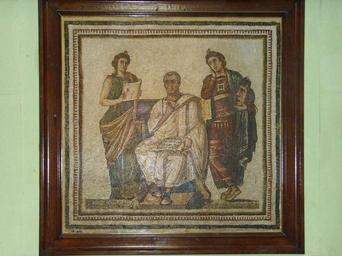 | Keywords: A mosaic BardoMuseum.JPG Der große lateinische Dichter Virgil in den Händen die Schrift Aeneid Links steht die Muse Klio Geschichte und rechts steht die Muse Melpomene Tragödie Das Mosaik das aus dem 3 Jahrhundert nach Christus stammt wurde in der Hadrumetum in Sousse Tunesien entdeckt und ist jetzt im Bardo-Museum in Tunis Tunesien The great Latin poet Virgil holding a volume on which is written the Aenid On either side stand the two muses Clio history and Melpomene tragedy The mosaic which dates from the 3rd Century A D was discovered in the Hadrumetum in Sousse Tunisia and is now on display in the Bardo Museum in Tunis Tunisia Mosaico romano del III secolo d C che rappresenta Virgilio con in mano l'Eneide tra le Muse Clio e Melpomene Scoperto a Sousse in Tunisia ora è esposto nel Museo del Bardo a Tunisi Mosaico con el poeta latino Virgilio junto a Clío musa de la Historia y Melpómene musa de la Tragedia Museo del Bardo Túnez; hallado en Sousse Siglo III d C en A mosaic in the Bardo National Museum Own Effi Schweizer 2009-03-19 Virgil Bardo jpg Virgil mosaic in the Bardo National Museum Tunis |
