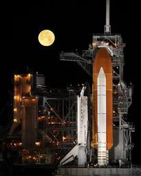 Keywords: moon space shuttle Discovery Launch pad 39A Kennedy Space Center Cape Canaveral Florida USA morning