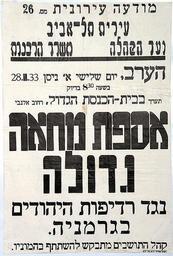 | Keywords: A poster calling to protest against the persecution of Jews in Germany, Tel Aviv 1933.jpg he מודעה מה-28 במרץ 1933 - כנגד רדיפות היהודי בגרמניה - יוצרה בת אביב מרץ 1933 עיריית ת אביב http //tel-aviv millenium org il/ D7 9C D7 95 D7 97+ D7 9E D7 95 D7 93 D7 A2 D7 95 D7 AA/ author PD-old Custom license marker 1933 03 28 PD-Israel Uploaded with UploadWizard The Holocaust | ||||