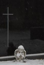 Keywords: a praying angel in front of the headstone angel praying in front of the tomb stone winter cemetery