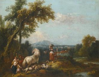 | Keywords: A Shepherd and his Family, Driving Sheep with a Dog and a White Horse by Francesco Zuccarelli.jpg en A Shepherd and his Family Driving Sheep with a Dog and a White Horse Encounter a Woman and her Child in a Pastoral Landscape by Francesco Zuccarelli oil on canvas 56 8 by 71 9 cm Sotheby's Creator Francesco Zuccarelli Francesco Zuccarelli PD-old-100 | ||||
