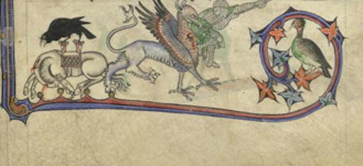| Keywords: A Soldier Fighting A Griffin In The 'Alphonso' Psalter.jpg en Heraldry on the first page of the Psalms text strongly suggests that this Psalter was commissioned by King Edward I for the marriage of his son Alphonso to Margaret daughter of Florent V Count of Holland which was to take place in 1284 Alphonso died before the wedding however and the decoration of the manuscript was left incomplete Additions were made in the early 14th century probably before 1316 In the lower border a horse lies dying presumably wounded by the griffin a fabulous monster with the head wings and claws of an eagle and the hindquarters of a lion which is being speared by the horse's rider a soldier in a full suit of chain-mail 1284 http //www bl uk/onlinegallery/onlineex/illmanus/other/011add000024686u00018000 html author PD-old-100 Uploaded with UploadWizard Soldiers |