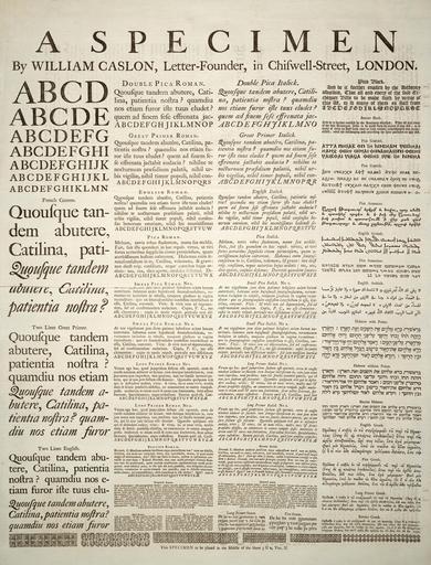 | Keywords: A Specimen by William Caslon.jpg Assessments 1 Typeset writing examples A specimen sheet of typefaces and languages by William Caslon I letter founder; from the 1728 en Cyclopaedia Schriftmusterblatt der Schriftgiesserei von William Caslon http //images library wisc edu/HistSciTech/EFacs/Cyclopaedia/Cyclopaedia02/XL/0089 jpg uploaded to the English Wikipedia by Janke as Image Caslonsample jpg probably deleted soon 16 26 23 March 2006 1728 or earlier William Caslon PD Caslon-schriftmusterblatt cleaned jpeg PD-old-100 Sample texts used Most of the texts have typographical errors preserved in their transcriptions here Square brackets contain differences between multiple occurences of the same sample text ; Latin text Ciceronis Oratio in Catilinam Prima; §§ 1 3 5 7 9 <sup> at wikisource </sup> Quousque tandem abutêre Catilina patientia nostra quamdiu nos etiam furor iste tuus eludet quem ad finem sese effrenata jactabit audacia nihilne te nocturnum præsidium palatii nihil urbis vigiliæ nihil timor populi nihil consensus bonorum omnium nihil hic munitissimus habendi se- Melium novis rebus studentem manu sua occîdit Fuit fuit ista quondam in hac repub virtus ut viri fortes acrioribus suppliciis civem perniciosum quam acerbissimum hostem coërcerent Habemus enim senatusconsultum in te Catilina vehemens grave non deest reip consilium neque autoritas hujus ordinis nos nos dico aperte consules desumus Decrevit quondam senatus At nos vigesimum jam diem patimur hebescere aciem horum autoritatis habemus enim hujusmodi senatusconsultum verumtamen inclusum in tabulis tanquam gladium in vagina reconditum quo ex senatusconsulto confestim interfectum te esse Catilina convenit Vivis vivis non ad deponendam sed ad confirmandam audaciam Cupio P C me esse clementem cupio in tantis reipub periculis non dissolutum videri sed jam meipsum inertiæ Verum ego hoc quod jampridem factum esse oportuit certa de caussa nondum adducor ut faciam tum denique interficiam te cum jam nemo tam improbus tam perditus tam tui similis inveniri poterit qui id non jure factum esse fateatur Quamdiu quisquam erit qui te defendere audeat vives vives ita ut nunc vivis multis meis firmis præsidiis obsessus ne commovere te contra rempub possis multorum te etiam oculi aures non sentientem sicut adhuc fecerunt speculabuntur atque custodient Etenim quid est Catilina quod jam amplius exspectes Novemb C Manlium audaciæ satellitem atque administrum tuæ num me fefellit Catilina non modo res tanta tam atrox tam incredibilis verum id quod multo magis est admirandum dies Dixi ego idem in senatu cædem te optimatum contulisse in ante diem v Kalend Novemb tum cum multi principes civitatis Rom non tam sui conservandi quam tuorum consiliorum reprimendorum caussa profugerunt num inficiari potes te illo ipso die meis præsidiis mea diligentia circumclusum commovere te contra rempub non potuisse; cum tu discessu ceterorum nostra tamen qui remansissemus cæde contentum te esse dicebas Quid cum te Præneste Kalend ipsis Novembris occupaturum nocturno O dii immortales ubi-nam gentium sumus quam rempub habemus in qua urbe vivimus hic hic sunt in nostro numero P C in hoc orbis terræ sanctissimo gravissimoque consilio qui de meo nostrumque omnium interitu qui de hujus urbis atque adeo orbis terrarum exitio cogitent hosce ego video consul de republica sententiam rogo quos ferro trucidari oportebat eos nondum voce vulnero Fuisti igitur apud Leccam ea nocte Catilina distribuisti partes Italiæ statuisti quo quemque proficisci placeret delegisti quos Romæ relinqueres quos tecum educeres descripsisti urbis partes ad incendia confirmasti te ipsum jam esse exiturum dixisti paululum tibi esse etiam tum moræ quod ego viverem Reperti sunt duo equites Romani qui te ista cura liberarent sese illa ipsa nocte paulo ante lucem me in meo lectulo interfecturos pollicerentur Hæc ego omnia vix dum etiam coetu vestro dimisso comperi domum meam majoribus præsidiis munivi atque firmavi exclusi eos quos tu mane ad me salutatum miseras cum illi ipsi venissent ; Saxon text Old English version of Venerabilis Baedae Historia ecclesiastica gentis Anglorum; book I §7 <sup> reference </sup> Ða he da mid grimmum fwinglum tintregum wæced wæs he ealle þa witu ðe him man dyde geþyldelice gefeonde sor dritne abær ar ; English text not identified And be it further enacted by the Authority aforesaid That all and every of the said Exchequer Bills to be made forth by virtue of this Act or so many of them as shall from time to time remain undischarged and uncancelled until the discharging and cancelling the same pursuant to this Act ; Gothic text First verse of the Lord's Prayer <sup> at wikisource </sup> 𐌰𐍄𐍄𐌰 𐌿𐌽𐍃𐌰𐍂 𐌸𐌿 𐌹𐌽 𐌷𐌹𐌼𐌹𐌽𐌰𐌼 𐍅𐌴𐌹𐌷𐌽𐌰𐌹 𐌽𐌰𐌼𐍉 𐌸𐌴𐌹𐌽 𐌵𐌹𐌼𐌰𐌹 𐌸𐌹𐌿𐌳𐌹𐌽𐌰𐍃𐍃𐌿𐍃 𐌸𐌴𐌹𐌽𐍃 𐍅𐌰𐌹𐍂𐌸𐌰𐌹 𐍅𐌹𐌰𐌾𐌰 𐌸𐌴𐌹𐌽𐍃 𐍃𐍅𐌴 𐌹𐌽 𐌷𐌹𐌼𐌹𐌽𐌰 ; Coptic text Genesis 1 1 3 <sup> http //www moheb de/Bible_books html at external site </sup> unified Greek and Coptic characters Ϧεη ουαρχη ὰφϯ θαμὸ ν τφε νεμ καϩι ικαϩι δε νε ουαθναυ ὲροϥ ε ουοϩ ν ατσοβϯ ουχακι ναϥχη εϫεν φνουν ουοϩ ου ͞ν͞α ν τεφϯ ναϥνηου ϩιϫεν νι ωου ο- disunified Coptic characters Ϧ ϯ ϩ ϩ ϥ ϩ ϯ ϥ ϫ ϩ ͞ ͞ ϯ ϥ ϩ ϫ - ; Armenian text Mosis Chorenensis Historia Armeniaca; book I §9 <sup> http //titus uni-frankfurt de/texte/etcs/arm/mokhor/mokho010 htm at external site </sup> Ա շակ Թագաւո ե կ ի և ծովու ո ոյ անձն և պատկե ո պէս և է իսկ մե Աստուծոց իսկ բախտ և պատահուﬓ ՚ի վե քան զա̅ մ թագաւո աց և մտաց լայնութ̅ ի ո չափ ե կնի ; Syriac text Peshitta; John 3 16 <sup> http //w