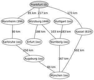Keywords: A-Star1.svg First Step of a run of the A search Algorithm on a map of Germany Created by de Benutzer Regnaron with graphviz A search algorithm 2005-11-06 own assumed Regnaron~commonswiki