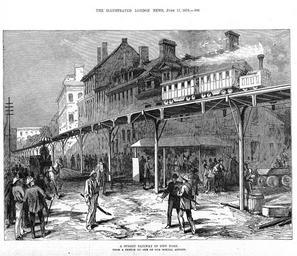 | Keywords: A Street Railway in New York - 1876 engraving.jpg en A Street Railway in New York - 1876 engraving showing a railway suspended above the ground on a narrow wooden track above a road held up by Y-shaped beams The Illustrated London News 1876-06-17 author A Street Railway in New York - 1876 engraving cropped jpg PD-old ILN 1876 1876 newspapers 1876 in rail transport in the United States 1876 in New York City IRT Third Avenue Line Bowery | ||||