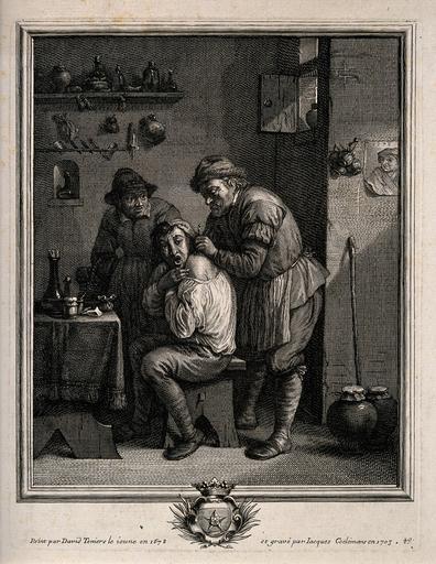 Keywords: A surgeon lancing a grimacing man's shoulder. Engraving by J Wellcome V0016731.jpg Artwork Creator Jacobus Coelemans A surgeon lancing a grimacing man's shoulder Engraving by J Coelemans 1703 after D Teniers the younger 1678 <p>Iconographic Collections<br> Keywords David Teniers; SURGERY; barber surgeon; Jacobus Coelemans Library reference ICV No 16863 Photo number V0016731 Full Bibliographic Record http //catalogue wellcomelibrary org/record b1180359 object history exhibition history credit line Wellcome Images http //wellcomeimages org/indexplus/obf_images/e7/b9/7e58fa813241c42a4c076b1f5dee jpg Gallery http //wellcomeimages org/indexplus/image/V0016731 html accession number PD-old-auto-1923 1735 Images uploaded by Fæ Wellcome V0016731 jpg Files from Wellcome Images check needed V0016731 jpg Works after David Teniers the Younger barber surgeon Jacobus Coelemans Surgery in the Wellcome Collection |
