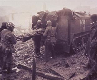 | Keywords: photographs national library of medicine nationallibraryofmedicine soldiers germany world war ii worldwarii wounded Contributor(s): United States. Army. Publication: [1944] Format: Still image Subject(s): Warfare Military Personnel Abstract: A wounded soldier lying on a stretcher is being loaded into a medic half-track. There is a red cross painted on the side of the vehicle. Another soldier looks on. One of the four soldiers holding the stretcher has a red cross painted on his helmet. The ground is muddy and there are ruined buildings in the background. According to photo caption, the picture was taken in Echtz, Germany. Extent: 1 photographic print : 21 x 26 cm. Technique: black and white NLM Unique ID: 101449147 NLM Image ID: A030170 Permanent Link: resource.nlm.nih.gov/101449147 Contributor(s): United States. Army. Publication: [1944] Format: Still image Subject(s): Warfare Military Personnel Abstract: A wounded soldier lying on a stretcher is being loaded into a medic half-track. There is a red cross painted on the side of the vehicle. Another soldier looks on. One of the four soldiers holding the stretcher has a red cross painted on his helmet. The ground is muddy and there are ruined buildings in the background. According to photo caption, the picture was taken in Echtz, Germany. Extent: 1 photographic print : 21 x 26 cm. Technique: black and white NLM Unique ID: 101449147 NLM Image ID: A030170 Permanent Link: resource.nlm.nih.gov/101449147 |