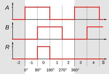 MAKE A MEME View Large Image AB Signal and Ref.svg 2 electrically by 90° phase-shifted square-wave pulses A B as output of en Rotary encoder and a Reference pulse R Below is the count at 4-fold evaluation 2 um 90° elektrisch phasenversetzte Rechteckimpulse A B wie ...
