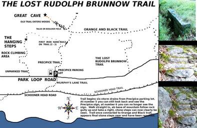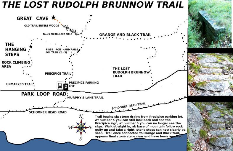 | Keywords: rudolph brunnow rudolphbrunnow acadia national park acadianationalpark abandoned trails abandonedtrails ghost trails ghosttrails lost trails losttrails phantom trails phantomtrails precipice precipice trail precipicetrail great cave greatcave the great cave thegreatcave beehive hanging steps hangingsteps champlain mountain champlainmountain east face trail eastfacetrail the high seas thehighseas acadia mount desert island mountdesertisland park loop road parklooproad maps of acadia mapsofacadia hiking maps of acadia national park hikingmapsofacadianationalpark maine text Very hard trail to locate, even with map and instructions, but it is there as you can see in the photos. Best way to locate area to enter woods, walk against traffic stopping to look back toward the Precipice parking lot at each storm drain. You will still be able to see the Precipice sign by the side of the park loop road. When you reach the storm drain where you look back and can no longer see the precipice sign, that is where the trail begins. You pretty much go right straight back to the base of Champlain Mountain. At that point make your way up a rocky gully as far as you can go, look to the right, there is the worn trail with stone steps. The reason for mapping out this trail is because of the man who built it, Rudolph Brunnow, the same man who gave us such trails as the Champlain East Face Trail, the Precipice Trail, The Beehive, the Hanging Steps and last but not least - the Great Cave trail. But this trail was not designed to be a main trail, it was a secondary trail which began at his front door, The High Seas - which he used to access the other trails he was building. Though its not much as far as trails go, I place this trail at the top of my finds as it was so damn hard to locate and because it was the trail Brunnow used to reach the other areas of his finest work. Sadly trails like the once popular Hanging Steps and the Great Cave loop were abandoned by the Park Service - but these sites can still be located and hiked today. Brunnow himself died from complications following a bad fall from one of his own trails. Very hard trail to locate, even with map and instructions, but it is there as you can see in the photos. Best way to locate area to enter woods, walk against traffic stopping to look back toward the Precipice parking lot at each storm drain. You will still be able to see the Precipice sign by the side of the park loop road. When you reach the storm drain where you look back and can no longer see the precipice sign, that is where the trail begins. You pretty much go right straight back to the base of Champlain Mountain. At that point make your way up a rocky gully as far as you can go, look to the right, there is the worn trail with stone steps. The reason for mapping out this trail is because of the man who built it, Rudolph Brunnow, the same man who gave us such trails as the Champlain East Face Trail, the Precipice Trail, The Beehive, the Hanging Steps and last but not least - the Great Cave trail. But this trail was not designed to be a main trail, it was a secondary trail which began at his front door, The High Seas - which he used to access the other trails he was building. Though its not much as far as trails go, I place this trail at the top of my finds as it was so damn hard to locate and because it was the trail Brunnow used to reach the other areas of his finest work. Sadly trails like the once popular Hanging Steps and the Great Cave loop were abandoned by the Park Service - but these sites can still be located and hiked today. Brunnow himself died from complications following a bad fall from one of his own trails. |
