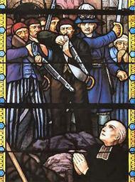 | Keywords: Abbé Nicolas.jpg en Stained glass window of the church in Chambretaud presenting the assassination of abbot François Nicolas by the French republican soldiers http //www loire-france com/histoire/guerres-vendee/vitraux/galerie/pages/vitrail-042 htm R Desjardins 1931 PD-old Stained glass windows in Vendée Église Notre-Dame-de-la-Nativité de Chambretaud Victims of the French Revolution Refractory clergy | ||||