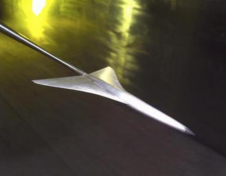 | Keywords: (C-2005-00946): This small model is one of several designs used in sonic boom studies conducted in the ASWT during the 2000s. The models were mounted on long stings, and strategically placed microphones detected the overpressure that humans hear as a double boom when planes fly past faster than Mach 1. These studies have suggested ways to soften the effect considerably. (C-2005-00946): This small model is one of several designs used in sonic boom studies conducted in the ASWT during the 2000s. The models were mounted on long stings, and strategically placed microphones detected the overpressure that humans hear as a double boom when planes fly past faster than Mach 1. These studies have suggested ways to soften the effect considerably. |