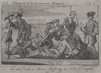 | Keywords: AbleDoctor RoyalAmericanMagazine02764003.jpg The able Doctor or America Swallowing the Bitter Draught Creator Paul Revere engraver Source Title The royal American magazine or Universal repository of instruction and amusement For June 1774 Boston Printed by and for I Thomas near the Market 1774 Cartoon showing a European gentleman with the Boston Port Bill in his pocket pouring tea down a native American woman's mouth She is being held down by a lascivious gentleman at her feet and a judge at her arms A woman holding a spear and shield covers her eyes while a gentleman holds a sword with Military Law on it In the background is a scene of Boston cannonaded and in the foreground is a tattered paper containing Boston's petition to England Britannia weeps as Frederick Lord North pours tea into the mouth of America while a Frenchman and a Spaniard with the Order of the Golden Fleece watch from the side William Murray first earl of Mansfield Lord Chief Justice and an opponent of repealing the Stamp Act holds America's wrist while John Montagu fourth earl of Sandwich First Lord of the Admiralty holds her ankles The man with a sword represents John Stuart earl of Bute prime minister for George III from 1762 to 1763 and instrumental in negotiating the Treaty of Paris in a Scottish hat and kilt Revere copied this image from an original in London Magazine Apr 1774 vol 43 p 185; the only change being that Revere added the word tea to the teapot The Boston Port Bill levied as a punishment for the Boston Tea Party was signed into law on March 31 1774 and provided the final wedge between Massachusetts and the crown Image is placed horizontally on page Published first by Isaiah Thomas and then Joseph Greenleaf in Boston this magazine was produced from January 1774 until April 1775 when the war put an end to publication Brown University John Carter Brown Archive of Early American Images http //www lunacommons org/luna/servlet/JCB~1~1 1774 Paul Revere; published in the Royal American Magazine 150px150px150px Royal American Magazine Engravings by Paul Revere Boston Tea Party in art 1774 cartoons 1770s political cartoons of the United States American Revolution England in the 1770s Boston in the 1770s Britannia Personifications of the United States PD-old-100 |