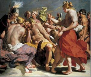| Keywords: Abraham Janssens - Mount Olympus.tiff en Abraham Janssens Mount Olympus oil on canvas 206 x 239 cm Alte Pinakotek <br> This work which is generally entitled Mount Olympus is based on Virgil Aeneid X 1-14 which describes a story from the Trojan War is Jupiter has called together all the Olympian gods in order to call for peace The love goddess Venus however disagrees and argues for the protection of the Trojans and her grandson Aeneas Holding the boy Amor by the hand she talks to the thoughtful pensive Jupiter and his wife Juno who is accused as an adversary of the Trojans On the far left Minerva in armour bends down to Juno Behind Jupiter stands Diana with the moon tiara Half hidden by the arm of Venus the scene is also witnessed by Apollo with lyre and the god of war Mars At the same time Hercules is seen approaching wearing a lion skin and carrying a club 1615 http //www pinakothek de/abraham-janssens/der-olymp Creator Abraham Janssens PD-old-100 PD-old-100 Aeneid Allegorical and mythological paintings by Abraham Janssens |