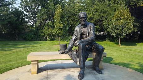 Keywords: abraham lincoln president statue bench giant sculpture bronze park tophat friend