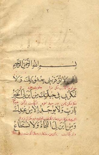 | Keywords: Abu Hamza al-Thumali.jpg Abu Hamza al-Thumali ابوحمزه ثمالی ترجمه تحت اللفظى است از دعاى مشهور ابوحمزه ثمالى كه از زين العابدين نقل شده و در سحرهاى ماه رمضان خوانده مى شود آغاز «الهى لا تودبنى بعقوبتك، ولا تمكر بى فى حيلتك تا پايان دعا» آغاز ترجمه «خداوندا تاديب مكن مرا به عقوبت خود، و مكر مكن با من درحيله خود » انجام ترجمه «و راضى كن مرا از عيش به آنچه قسمت كرده اى از براى من، اى رحم كننده ترين رحم كنندگان» نسخ ترجمه نيز به نسخ و شنگرف زير نويس، جلد تيماج قهوه اى بدون مقوا، مرمت شده، دو مهر بيضوى «محمد الحسينى» و «عبده سيد محمد الحسينى بن عبدالمجيد» روى برگ اول ديده مى شود http //library masoumeh com/8/index php id pn 240 Author PD-old-100 Multilingual media Arabic manuscripts Persian manuscripts Shi'a Islam Multilingual manuscripts |