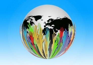 Keywords: access many hands continents globe international earth together community colorful multicolored symbol harmony gesture finger solidarity support connectedness design help concept circle district circles orbit presentation give