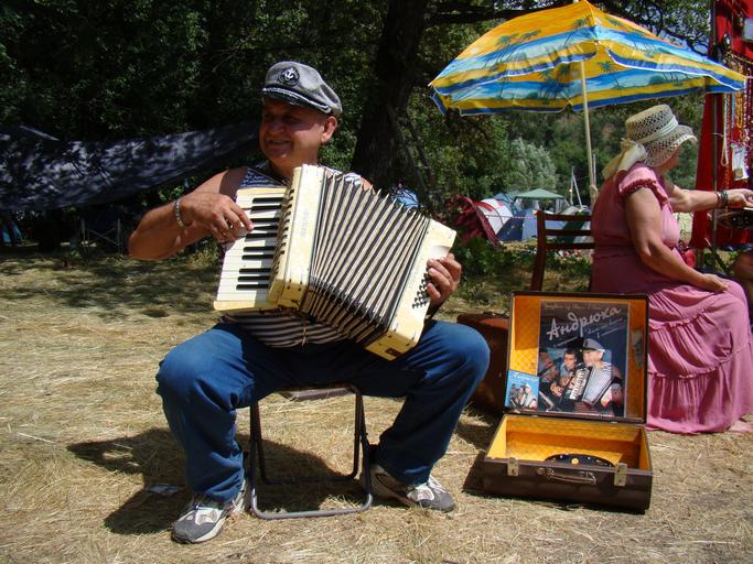 Keywords: accordion player man accordion music umbrella vest sailor peaked cap anchor sun lady hat summer trees tents