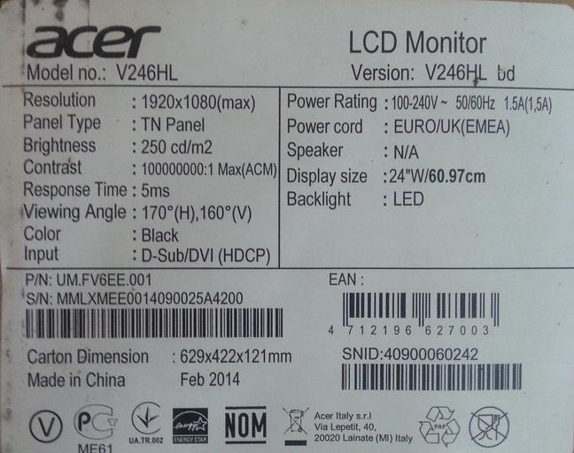 Keywords: Acer-acer v246hl-sticker-box.jpg en Sticker of Acer display model V246HL produced in 2014 2014-06-29 12 59 06 own Rakoon 32 3 42 559 N 34 49 29 605 E alt 58_source exif_heading cc-zero Uploaded with UploadWizard Acer LCD computer monitors