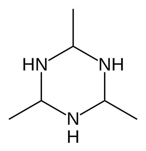 Keywords: Acetaldehyde ammonia trimer.svg Skeletal formula of acetaldehyde ammonia trimer hexahydro-2 4 6-trimethyl-1 3 5-triazine Created using http //www acdlabs com/download/chemsk html ACD/ChemSketch 10 0 and Inkscape Own 2007-02-26 Fvasconcellos Six-membered nitrogen heterocycles Saturated nitrogen heterocycles Trimers |