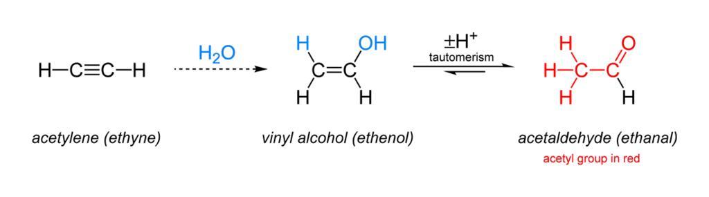 Keywords: Acetylene-hydration-2D.png en Scheme illustrating the hydration of acetylene to acetaldehyde for the discussion of the origin of the name acetylene and its relation to the acetyl group Own 2009-02-02 Ben Mills Benjah-bmm27 Images by Ben Mills Acetylene Hydration reactions |