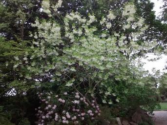 Keywords: Rhodo R7H bloom next to fringetree whiteflower pinkflower d5 r8 rhodo earlyjune 7h chionanthusvirginicus ach07 earlyjun