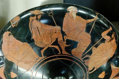 | Keywords: Achilles embassy Louvre G264.jpg Tarquinia Painter The embassy to Achilles Book 9 of the Iliad from left to right Achilles sulking wrapped in his cloak Hermes with the caduceus Phoenix white-haired and Odysseus Detail of an Attic red-figure cup ca 480 BC “470 BC From Vulci L'ambassade auprès d'Achille livre IX de l ™Iliade de gauche à droite Achille Hermès PhÅ“nix et Ulysse Détail d'une coupe attique à figures rouges v 480-470 av J -C Provenance Vulci H 14 1 cm 5 ½ in Diam 32 1 cm 12 ½ in W 40 4 cm 15 ¾ in Museum Louvre Department of Greek Etruscan and Roman Antiquities Sully 1st floor case 6 object history credit line De Witte Bequest 1890 accession number G 264 Jastrow 2006 other versions <gallery> Image Achilles embassy Louvre G264 n2 jpg Achilles sulking Image Achilles embassy Louvre G264 n3 jpg Hermes Image Hermes e seu caduceu jpg Hermes </gallery> Embassy to Achilles Achilles in ancient Greek pottery Odysseus in ancient Greek pottery Caduceus in France Hermes in ancient Greek pottery Kylixes Tarquinia Painter Greek antiquities in the Louvre - Room 39 Ancient Greek pottery from Vulci 5th-century BC pottery in France Paris Phoenix in ancient Greek pottery |