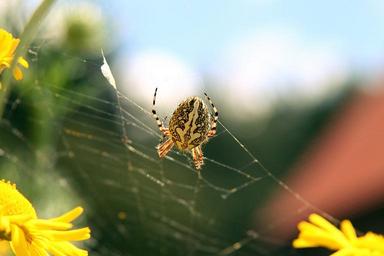 Keywords: acorn leaf radnetzspinne summer sun sunshine yellow flowers blue sky edge of the woods glade meadow spider