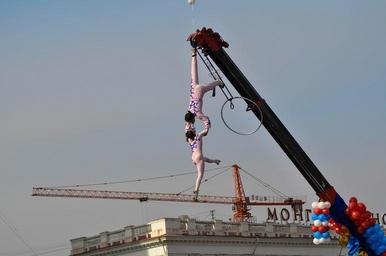 Keywords: acrobat circus performance street outdoor open air woman challenging balance stage entertainment gymnast girl mongolia crane construction