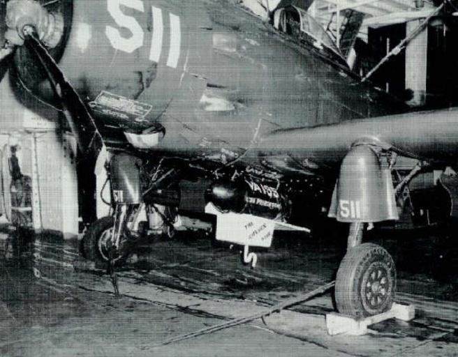 | Keywords: AD-4 VA-195 KitchenSinkBomb Aug1952.jpg en A U S Navy Douglas AD-4 Skyraider of attack squadron VA-195 Dambusters with a special ordnance aboard the aircraft carrier USS Princeton CVA-37 in August 1952 VA-195 was assigned to Carrier Air Group 19 CVG-19 for a deployment to the Korean War from 21 March to 3 November 1952 The special weapon was a 454 kg 1000 lb bomb with a kitchen sink attached The idea came up when the squadron's executive officer LCdr M K Dennis remarked during a meeting with the press We dropped everything on them the North Koreans but a kitchen sink Royal J Deland ADC and J Burnett ADC then produced a bomb with a kitchen sink attached The commanding Admiral was not pleased by this and would not allow to drop the bomb for a week However press coverage in the United States obviously led to the dropping of this bomb in August 1952 on Pyongyang by Lt jg Carl B Austin http //138 147 50 20/a-korea/dec52-12 pdf USS Princeton website http //groups msn com/USSPrincetonCV37/photoalbum msnw action ShowPhoto PhotoID 168 U S Navy sailor or employee 1952-08 PD-USGov-Military-Navy AD-4 Skyraider Military aircraft in the Korean War Aboard USS Princeton CV-37 Strike Fighter Squadron 195 United States Navy |