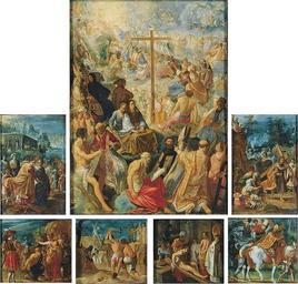 | Keywords: Adam Elsheimer - Der Frankfurter Kreuzaltar.jpg Artwork Creator Adam Elsheimer Verherrlichung des Kreuzes durch Heilige Propheten und Engel Die sechs begleitenden Szenen erzählen die Legende von der Auffindung der Rückeroberung und dem Rücktransport jenes Kreuzes nach Jerusalem an dem Jesus gestorben sein soll <br> Auf der Mitteltafel Verherrlichung des Kreuzes sind rechts unten die Patriarchen einschließlich Moses Abraham und König David Jonas sitzt auf dem Wal mit zum Kreuz erhobenem Blick Links am Fuß des Kreuzes sind die hl Katharina und Maria Magdalena in schwesterlicher Umarmung Links unten im Vordergrund ist ein Streit zwischen dem hl Sebastian und den vier Kirchenvätern Papst Gregor Die sechs umrahmenden Szenen erzählen die Legende von der Auffindung und dem Rücktransport des Kreuzes an dem Jesus gestorben sein soll nach Jerusalem In the central panel the Glorification of the cross by the Saints the prophets and the angele is shown On the right are the 4 the patriarchs including Moses Abraham and King David Jonas is sitting on the fish looking up towards the cross and St Catherine and Mary Magdalene are in a sisterly embrace In the foreground is a disputation between St Sebastian and the 4 Fathers of the Church Pope Gregory St Jerome St Ambrose and St Augustine with the first Christian martyrs St Stephen and St Laurence - 1603 1605 Oil on copper langSwitch versilbert silvered cm 133 6 107 ; LangSwitch Mittelteil central panel centre middenpaneel cm 48 5 35 Institution Städel Städel http //www staedelmuseum de/de/geschichte-des-museums Geschichte des Museums http //www staedelmuseum de/de/highlights-der-sammlung Highlights der Sammlung / http //www staedelmuseum de/en/collection-highlights Collection Highlights object history LangSwitch Mittelteil central panel centre middenpaneel ProvenanceEvent 1950 acquisition Städel de bis 1980 werden die restlichen 6 Täfelchen nacheinander entdeckt und angekauft credit line Teileigentum des Städelschen Museums-Vereins e V accession number 2024 2054 2118 2119 2131 2140 2142 http //www google com/culturalinstitute/asset-viewer/the-altarpiece-of-the-exaltation-of-the-true-cross/TAE1mjxSM0ri8w projectId art-project google com thumb left PD-old-100 DEFAULTSORT Elsheimer Adam; Altar piece Frankfurter Kreuzaltar 00 Gesamtansicht; Stadel ImageNote 1 553 1609 532 466 2183 2085 2 Ausgrabung der Kreuze 300px ImageNoteEnd 1 ImageNote 2 17 17 469 810 2183 2085 2 title The Altarpiece of the Holy Cross Der Frankfurter Kreuzaltar Die Auffindung und Verherrlichung des Wahren Kreuzes ImageNoteEnd 2 Paintings by Adam Elsheimer German paintings in the Städel Baroque paintings in the Städel 1600s paintings in the Städel 17th-century paintings of New Testament |