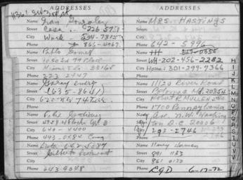 | Keywords: Address Book of Watergate Burglar Bernard Barker, Discovered in a Room at the Watergate Hotel, June 18, 1972 - NARA - 304966.tif Scope and content This address book lists HH initials for Howard Hunt a White House consultant After confirming that the telephone number listed here was indeed at the White House the FBI linked the Watergate break-in to the White House during the investigation's earliest hours General notes Exhibit History American Originals December 1997 - December 1998 National Archives Rotunda Washington DC Exhibit No 624 0217 Recent America June 1984 - December 1985 National Archives Rotunda Washington DC Exhibit No 533 0374 304966 Local identifier U S District Court for the District of Columbia 1936 - Special Access/FOIA Section Textual Archives Services Division NWCTF National Archives at College Park 8601 Adelphi Road College Park MD 20740-6001 Record group Record Group 21 Records of District Courts of the United States 1685 - 2004 Record group ARC 350 Watergate-Related Cases compiled 06/1972 - 1986 Series ARC 304963 File unit United States versus G Gordon Liddy Eugenio Martinez Frank Sturgis E Howard Hunt James McCord Bernard Barker and Virgilio Gonzalez 06/1972 - 1986 File unit ARC 304964 Variant control numbers NAIL Control Number NWCTF-21-USDISTCTDC-CRUSVLIDDY-GOVEX38<br /> NAIL Control Number NWDDA-21-USDISTCTDC-CR-USVLIDDY-GOVEX38<br /> Search Identifier siLearning Center<br /> Search Identifier siNational History Standard Era 10 yes Other versions <gallery> File Address_Book_of_Watergate_Burglar_Bernard_Barker _Discovered_in_a_Room_at_the_Watergate_Hotel _June_18 _1972_-_NARA_-_304966 tif tif File Address_Book_of_Watergate_Burglar_Bernard_Barker _Discovered_in_a_Room_at_the_Watergate_Hotel _June_18 _1972_-_NARA_-_304966 jpg jpg </gallery> NARA-cooperation PD-USGov Watergate scandal Documents in English Address books NARA TIF images with categorized JPGs |