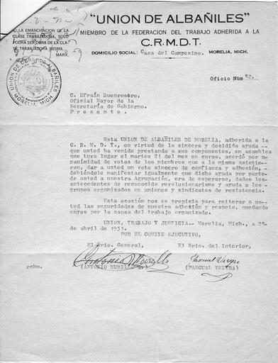 Keywords: Adhesion Union de Alanilies-Oficial Mayor Michoacan.jpg es Documento de agradecimiento a Efrain Buenrostro por parte de la Union de Albañiles de Michoacan Union deAlbañiles Union de Albañiles 1931-04-25 Own file Political documents