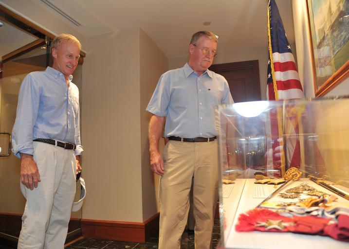 | Keywords: Adm. Chester Nimitz's grandsons at Pearl Harbor 130830-N-IT566-010.jpg en Chester Nimitz Lay left and Richard Lay right grandsons of fleet Adm Chester Nimitz look at some personal effects of their grandfather's during a tour of the fleet headquarters compound where their grandfather worked and lived The Lays are in Hawaii for a ceremony to commemorate the 68th anniversary of end of World War II Sept 2 aboard the Battleship Missouri Memorial where a bronze statue of Adm Nimitz will also be unveiled Nimitz served as the commander in chief for U S Pacific Fleet from Dec 31 1941 to Nov 24 1945 U S Navy Photo by Mass Communication Specialist 2nd Class David Kolmel 2013-08-30 Petty Officer 2nd Class David Kolmel https //www dvidshub net/image/1008014 130830-N-IT566-010 2013-08-30 23 43 PEARL HARBOR HI US PD-USGov-Military-Navy Battleship Missouri Memorial Images from DoD uploaded by Fæ |