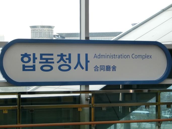 Keywords: Administration Complex Station sign.JPG Administration Complex Station sign 합동청사역 역명판 合同庁舎駅駅名標 own 2016-02-21 Abasaa あばさー Train station signs in South Korea Bilingual signs in South Korea Incheon Airport Maglev