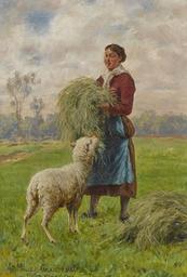 | Keywords: Adolf Müller-Grantzow Bauernmädchen mit Schaf.jpg Bauernmädchen mit Schaf Links unten signiert und Ortsbezeichnung München Öl auf Holz 26 5 x 18 5 cm http //www neumeister com/ before 1923 Creator Adolf Müller-Grantzow PD-old-70-1923 Images from Neumeister Kunstauktionen Adolf Müller-Grantzow Haymaking in art People with sheep in art Feeding animals in art | ||||
