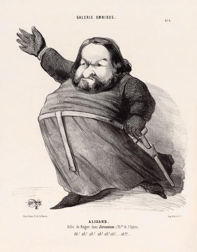 | Keywords: Adolphe-Joseph-Louis Alizard from Le Charivari.jpg en Adolphe-Joseph-Louis Alizard as Roger in Jérusalem at the Paris Opéra 1847 http //gallica bnf fr/ark /12148/btv1b85294142 Gallica Published by Aubert et Cie http //catalogue bnf fr/servlet/RechercheEquation TexteCollection HGARSTUVWXYZ1DIECBMJNQLOKP TexteTypeDoc DESNFPIBTMCJOV Equation IDP 3Dcb396021383 host catalogue in Le Charivari 1847 The major artist for Le Charivari was Benjamin Roubaud 1811-1847 which seems likely as an attribution; compare http //gallica bnf fr/ark /12148/btv1b7200487p/f1 image r Benjamin 20Roubaud langEN Otherwise this is anonymous <p> Restored by Adam Cuerden other versions File Adolphe-Joseph-Louis Alizard from Le Charivari jpg - Restoration JPEG File Adolphe-Joseph-Louis Alizard from Le Charivari png - Restoration PNG File Adolphe-Joseph-Louis Alizard from Le Charivari - Original jpg - Original JPEG Assessments 1 Adolphe-Joseph-Louis Alizard from Le Charivari Probably PD-old-70-1923 If this is not by Roubaud and the Bibliothèque Nationale de France doesn't identify an artist this would be Anonymous-EU Jérusalem Adolphe-Joseph-Louis Alizard |