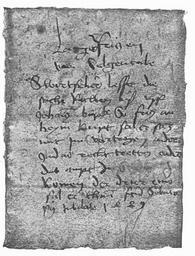 | Keywords: Adresse Femebrief.JPG Femebrief von 1489 - Anschrift Verkleinerte Wiedergabe; Original befand sich 1897 im Privatbesitz in Berlin; eingescannt aus Henne am Rhyn Dr Otto Kulturgeschichte des deutschen Volkes Erster Band Berlin 1897 S 374; Der Text lautet Langeck Fritzen van Selgentale Swertfeher lesset die sache ruwen biß uff Johannes Babt So Fritz an heym kompt sal er sich mit im vertragen oder das ampt zu Seligental komen der drier eins sol er thun Actum Sabato post Jubilate 1489 Original befand sich 1897 im Privatbesitz in Berlin; eingescannt aus Henne am Rhyn Dr Otto Kulturgeschichte des deutschen Volkes Erster Band Berlin 1897 S 374; Otto Henne am Rhyn Aufgefaltet befand sich auf der Rückseite folgender Femebrief thumb Femebrief von 1489 PD-old-100 Medieval documents from Germany 1489 in Germany 1489 documents Late Middle Ages |
