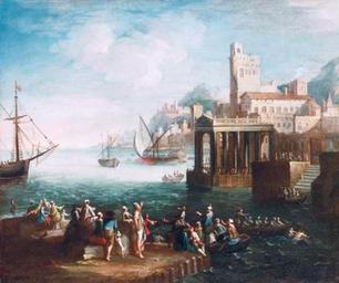 | Keywords: Adriaen van der kabel - Capriccio van een Mediterraanse haven.jpg artwork en A capriccio of a Mediterranean port with figures on a quay and shipping beyond date oil on canvas in 24 29 Sold with a photocopy of a letter from Dott Dario Succi dated 9 August 1996 confirming the attribution to Adriaan van der Cabel Christie's online 4360146 1416 18 New York 5 - 6 October 2004 PD-old-100 Attributed to Adriaen van der Kabel | ||||
