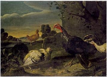 | Keywords: Adriaen van Utrecht - Turkeys and chickens.jpg Turkeys and chickens 1646 oil on canvas size cm 121 170 2 object history signed and dated 'Adriaen van Uytrecht fec ano 1646' http //www christies com/lotfinder/paintings/adriaen-van-utrecht-dindons-et-poules-5456814-details aspx Sold at Christie's on 21 June 2011 Paris PD-old-100 Paintings of live animals by Adriaen van Utrecht 17th-century oil on canvas paintings | ||||