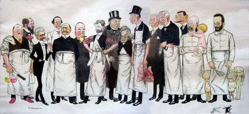 | Keywords: Adrien Barrère33c.jpg André Chantemesse 1851-1919 Experimental Medicine Georges Pouchet 1833 - 1894 Histology and Anatomy Paul Poirier 1853-1907 Anatomy Georges Dieulafoy 1839-1911 Pathology Georges Debove 1845-1920 Paul Brouardel 1837-1906 Medicine Samuel Pozzi 1846-1918 Gynaecology Paul Tillaux 1834-1904 Surgery Georges Hayem 1841-1933 Clinical Medicine Victor Cornil 1837-1908 Pathology Paul Berger 1845-1908 Member of the Academy of Medicine Felix Guyon 1831-1920 Urology Pierre Launois 1856-1914 Histology Adolphe Pinard 1844-1934 Obstetrics Pierre Budin 1846-1907 Obstetrics A standing group of 15 doctors wearing dark suits some with white aprons Each person is in a characteristic pose with an object related to his speciality From left to right one finds Georges Pouchet 1833 - 1894 holding a poisonous fungus since he was a doctor and naturalist like his father Félix-Archimède In front of him André Chantemesse 1851-1919 with some flasks and a bottlebrush was doctor and bacteriologist In front Paul Poirier 1853-1907 anatomist and surgeon wears evening dress and the rose he holds marks him as a man of the world Behind P Poirier are Georges Dieulafoy 1839-1911 clinical professor of medicine at Paris Hospital and Georges Debove 1845-1920 specialist in the nervous system Both present a serious face To his side Paul Brouardel 1837-1906 smoking a cigar rounded face expressing a certain bonhomie He is the foremost French hygienist was police chief with the government in this field In the foreground next to Poirier with hands on hips and business-like air Samuel Pozzi 1846-1918 father of French gynaecology and skilful surgeon his instruments attached to his apron the forceps which bear his name and used for aiding with deliveries Behind Pozzi is Paul Tillaux 1834-1904 anatomist and surgeon interested in the thyroid gland At his side Georges Hayem 1841-1933 hematologist whose interest was chlorhydropsy in the blood pepsin and hydrochloric acid in the gastric juice Next to Georges Hayem is the large Victor Cornil 1837- 1908 master of pathological anatomy and microscopy holding a pair of lungs in his left hand Felix Guyon 1831-1920 holds a syringe - he was surgeon and urologist at the Necker hospital Next to Guyon in evening dress Paul Berger 1845-1908 surgeon at various hospitals in Paris specialist in interventions of the limbs neck and face The man with sweeping moustache is Pierre Launois 1856-1914 doctor and histologist who defined the nature of gigantism The last two individuals dressed entirely in white are Adolphe Pinard and Pierre Budin obstetricians and disciples of pasteurism A Pinard 1844-1934 father of French pediatrics carries a child in his arms In 1891 he wrote a work on breast-feeding and devoted his life to care of the expectant mother P Budin 1846-1907 holds in his right hand a pair of forceps and is accompanied by three foetuses He was obstetrician at the hospital of Charity in Paris fought against puerperal fever from 1870 and started the neonatal care of infants In the right foreground a small character dressed in black wearing a hat and carrying an umbrella is pursued by a giant speculum http //www kugener com/abfrage php id 1161 Adrien Barrère 1877-1931 1904 PD PD-old Adrien Barrère Paul Berger surgeon Aprons in art 1904 in Paris Caricatures of France Pierre-Constant Budin |