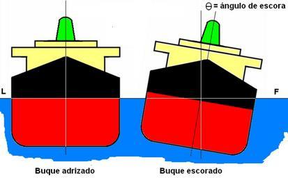 Keywords: Adrizadoescorado.PNG right and port list spanish Own 2006-12-25 Claudio Elias GFDL Gráfico de buque adrizado escorado a babor y ángulo de escora Vista desde proa Ship stability