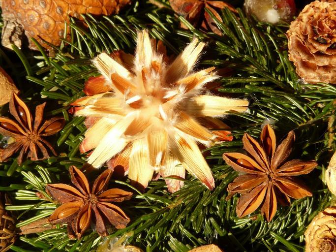 Keywords: advent wreath seeds ornament silver seed dried flowers decoration leucospermum protea star anise fruit ripe sternanis real illicium verum star anise plant schisandraceae ripe fruit anisi stellati fructus