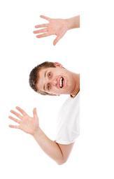 Keywords: advert advertisement background billboard blank board card display empty isolated male man message paper people person poster space white young