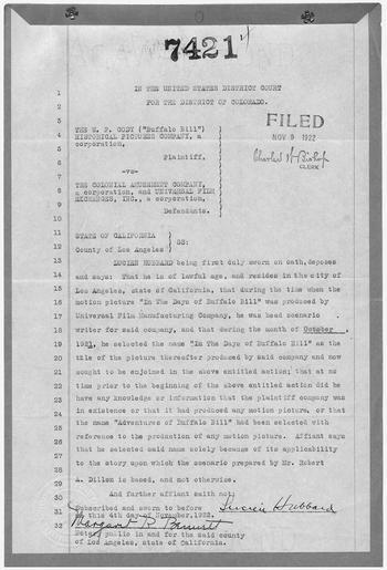 | Keywords: Affidavit of Lucien Hubbard - NARA - 292764.tif Scope and content Hubbard a screenwriter from Los Angeles testifies that he created the title for the film In the Days of Buffalo Bill General notes 292764 Local identifier U S District Court for the District of Colorado 1876 - NARA's Rocky Mountain Region Denver NRGA Building 48 Denver Federal Center West 6th Avenue and Kipling Street Denver CO 80225-0307 1922-11-04 Record group Record Group 21 Records of District Courts of the United States 1685 - 2004 Record group ARC 350 U S District Court District of Colorado Civil Case Files compiled 1912 - 1947 Series ARC 292734 File unit The W J Cody 'Buffalo Bill' Historical Pictures Co vs The Colonial Amusement Co et al 09/08/1913 - 10/19/1922 File unit ARC 292735 Variant control numbers NAIL Control Number NRG-21-E27-7421-HUBBARD yes Other versions NARA-cooperation PD-USGov Copyright law of the United States In the Days of Buffalo Bill Courts of the United States Documents in English Affidavits |