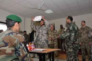| Keywords: Afghan Forces graduate from IED-Defeat-EOD training 111215-N-CB888-005.jpg en An Afghan National Army soldier proudly displays his certificate during a graduation ceremony held at the Afghan National Army Engineer School near Camp Spann Dec 15 Fifteen Afghan servicemen graduated in the ceremony and can now wear the Explosive Ordnance Disposal patch and badge after completing 22 weeks of intensive EOD and Improvised Explosive Device Defeat training The Engineer School is the only one in Afghanistan that teaches the fundamentals of EOD and IEDD to Afghan National Security Forces International Security Assistance Force Regional Command North supports Afghan National Security Forces in close coordination and collaboration in providing security and disrupting the insurgents' activities in order to protect the population secure the highways and support the Afghan Border Patrol operations in the border areas and crossing points in order to set the conditions for economic social and cultural development in key terrain districts 2011-12-15 Chief Petty Officer Oscar Troncoso https //www dvidshub net/image/501565 111215-N-CB888-005 2011-12-19 08 22 MAZAR-E-SHARIF AF PD-USGov-Military-Navy Soldiers of the Afghan National Army Images from DoD uploaded by Fæ |